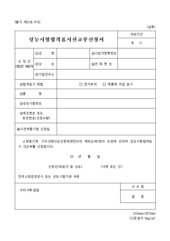 9,000원/월성능시험합격표시선교부신청서 양식은 신청인의 인적사항 및 합격표시방법, 품명, 성능시험번호 등의 항목으로 구성되어 있습니다.