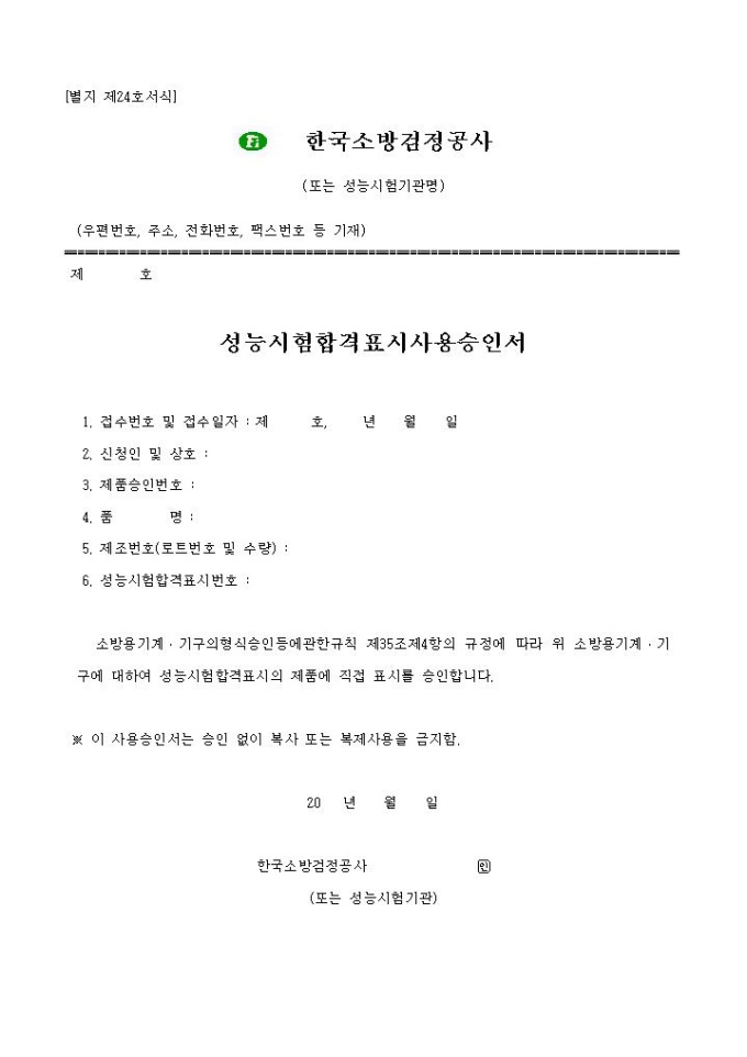 9,000원/월성능시험합격표시사용승인서 양식은 접수번호 및 접수 일자, 신청인, 상호, 제품승인번호, 품명 등의 항목으로 구성되어 있습니다.