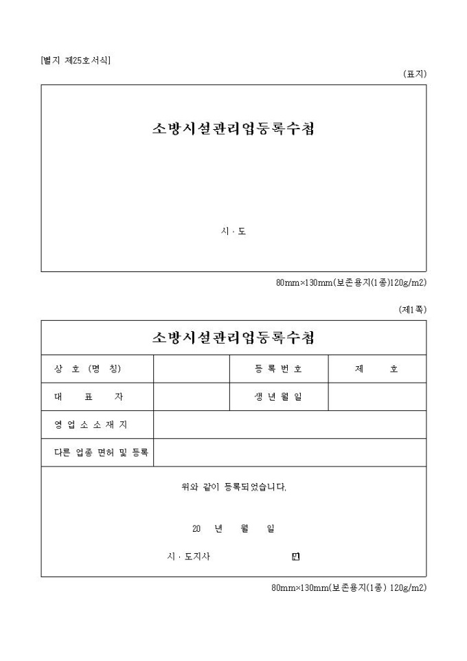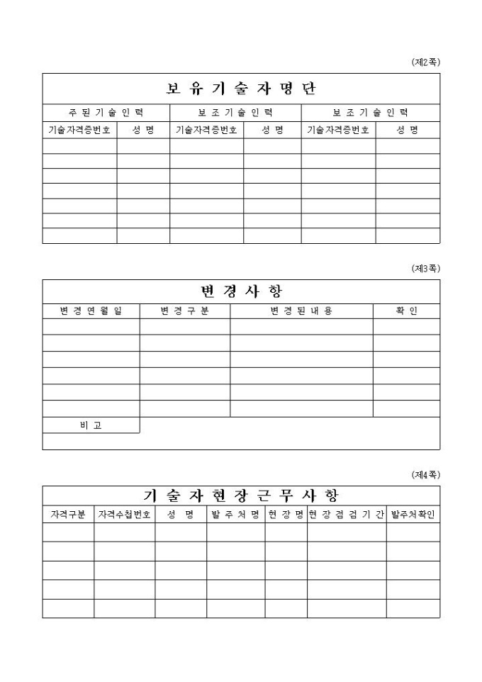 9,000원/월소방시설관리업등록수첩 양식은 보유기술자 명단, 변경사항, 기술자 현장 근무사항 등의 항목으로 구성되어 있습니다.