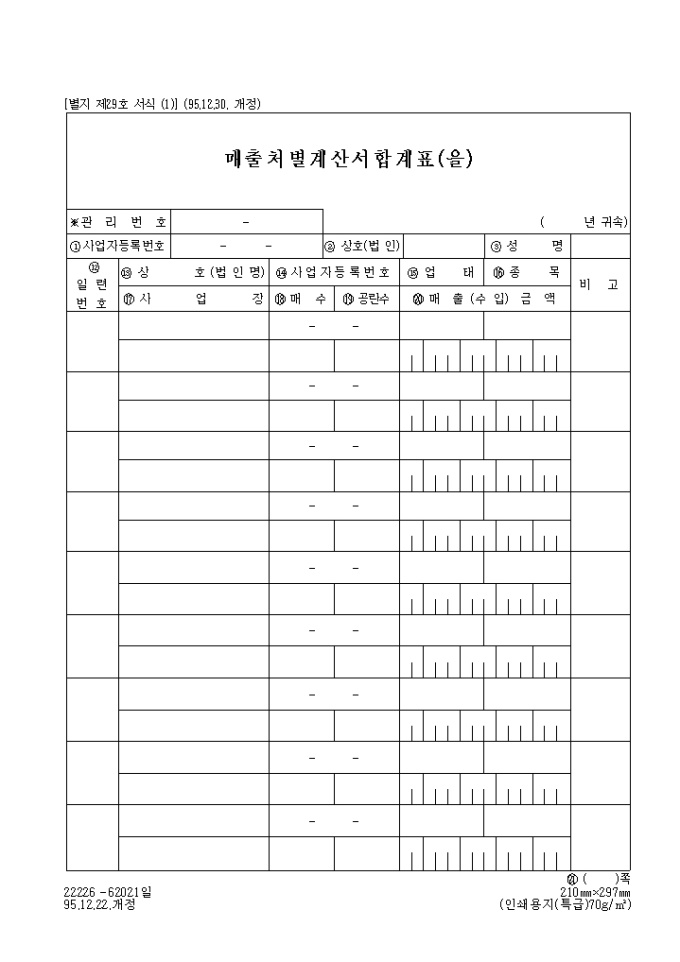 9,000원/월[별지 제29호 서식 (1)] 매출처별계산서합계표(을) 양식입니다. 일련번호, 사업장, 매수, 공란수, 매출(수입)금액등의 항목으로 구성된 양식입니다.