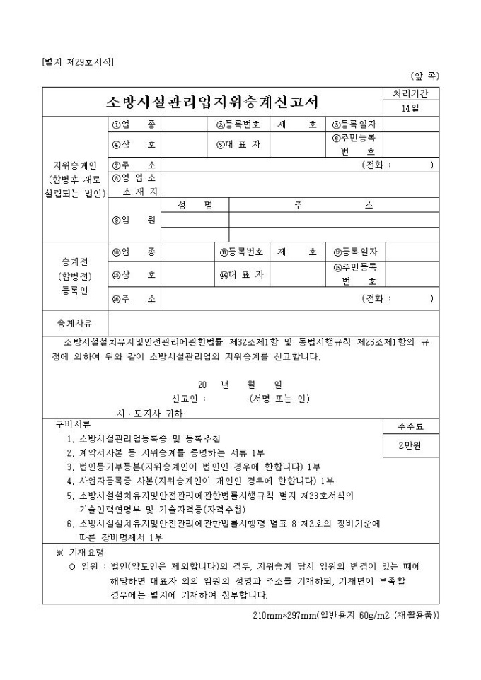 9,000원/월소방시설관리업지위승계신고서 양식은 지위승계인 및 승계전의 업종, 등록번호, 상호 등의 항목으로 구성되어 있습니다.