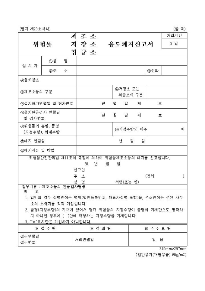 9,000원/월위험물(제조소저장소취급소)용도폐지신고서 양식은 설치자, 설치장소, 제조소등의 구분, 설치허가 연월일 및 허가번호 등의 항목으로 구성되어 있습니다.