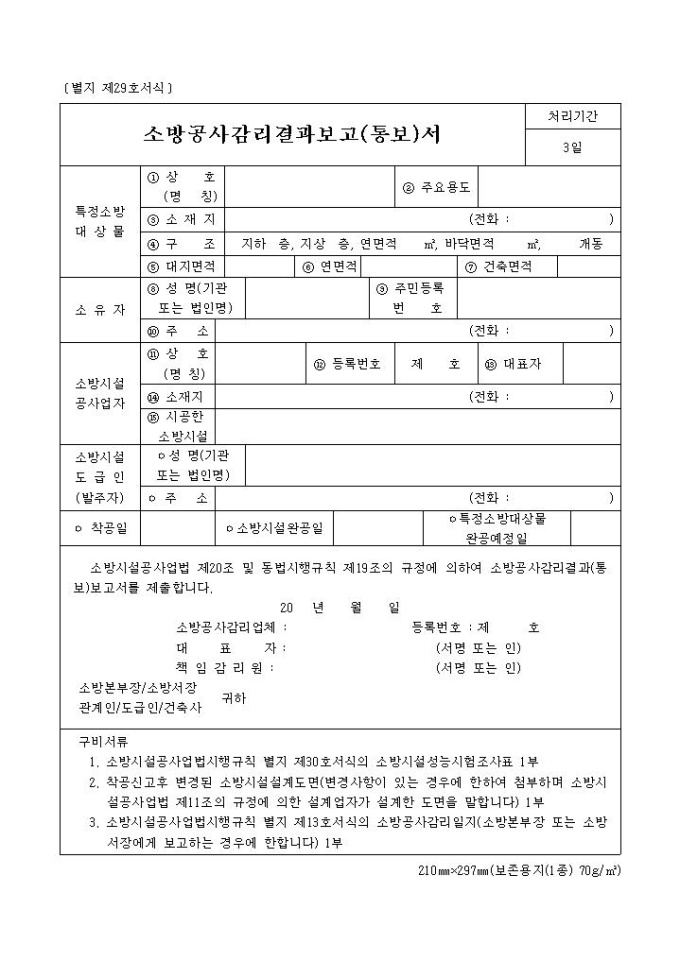 9,000원/월소방공사감리결과보고(통보)서 양식은 특정 소방 대상물, 소유자, 소방시설 공사업자, 소방시설 도급인 등의 항목으로 구성되어 있습니다.