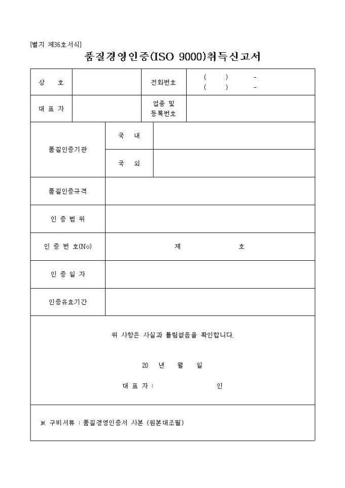9,000원/월품질경영인증(iso 9000)취득신고서 양식은 상호, 대표자, 전화번호, 업종 및 등록번호, 품질인증기관 등의 항목으로 구성되어 있습니다.