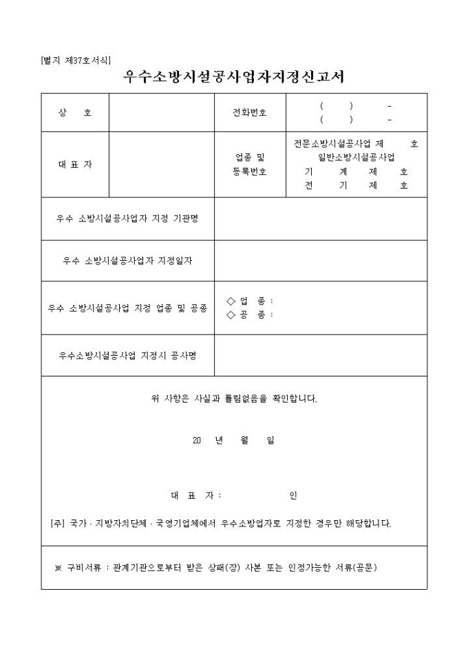 9,000원/월우수소방시설공사업자지정신고서 양식은 상호, 업종 및 등록번호, 우수 소방시설공사업자 지정 기관명, 우수 소방시설공사업자 지정 일자 등의 항목으로 구성되어 있습니다.