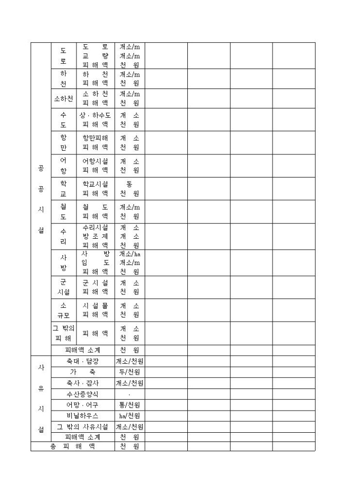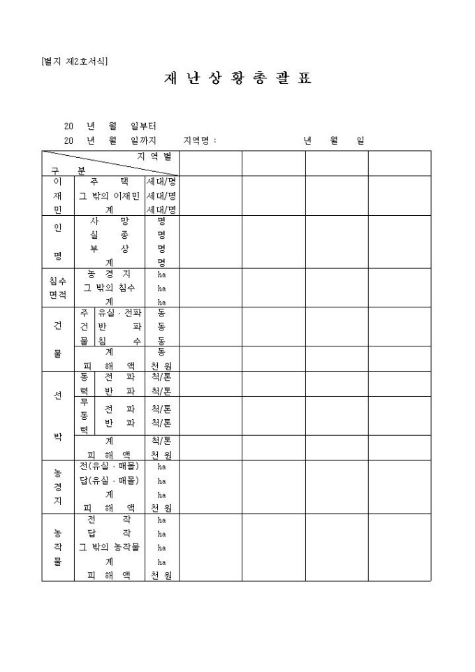 9,000원/월재난상황총괄표 양식은 이재민수 침수면적, 건물, 선박, 농경지 등의 피해면적의 항목으로 구성되어 있습니다.