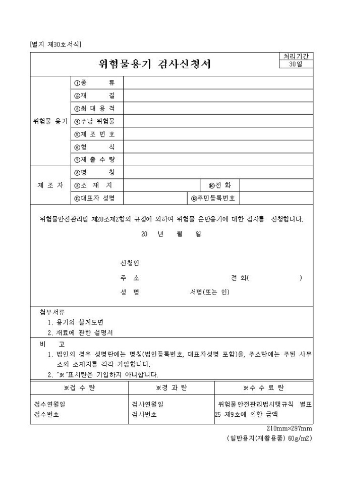 위험물용기 검사신청서(별지 제30호서식)
