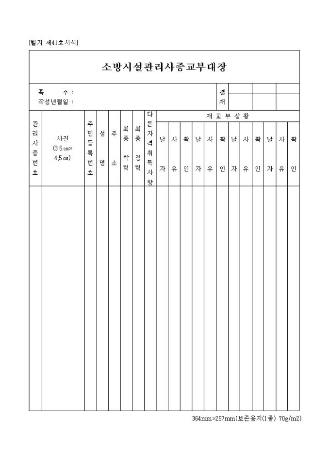 9,000원/월소방시설관리사증교부대장 양식은 관리사증번호, 사진, 주민등록번호, 성명, 주소, 최종학력, 최종경력 등의 항목으로 구성되어 있습니다.