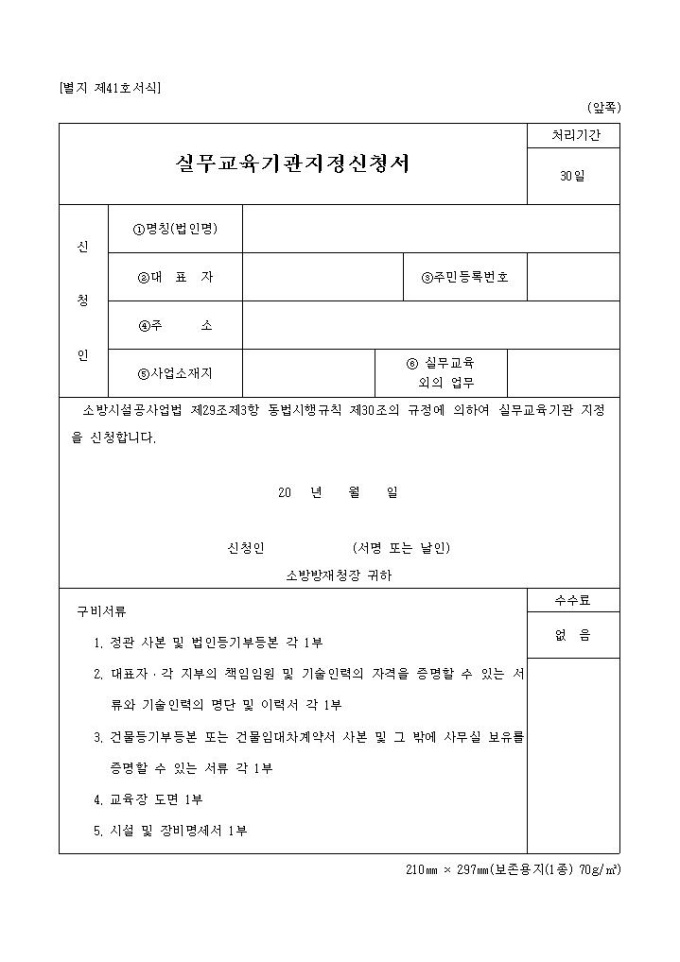 9,000원/월실무교육기관지정신청서 양식은 신청인의 명칭(법인명), 대표자, 주소, 사업소 소재지 등의 항목으로 구성되어 있습니다.