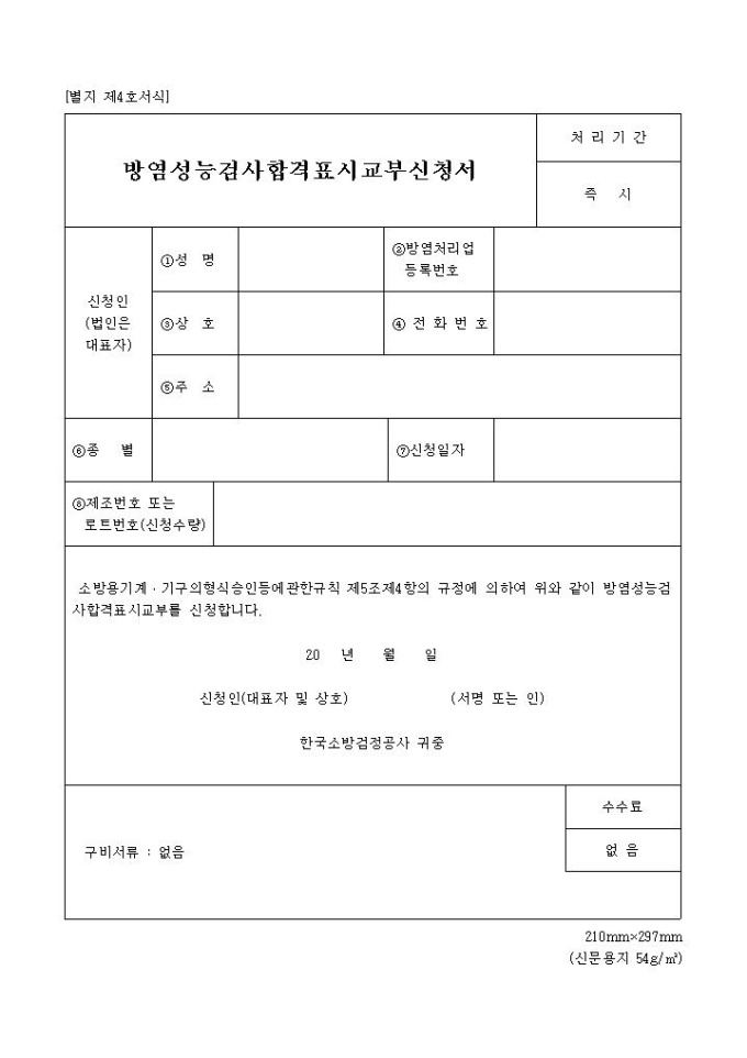 방염성능검사합격표시교부신청서(별지 제4호서식)