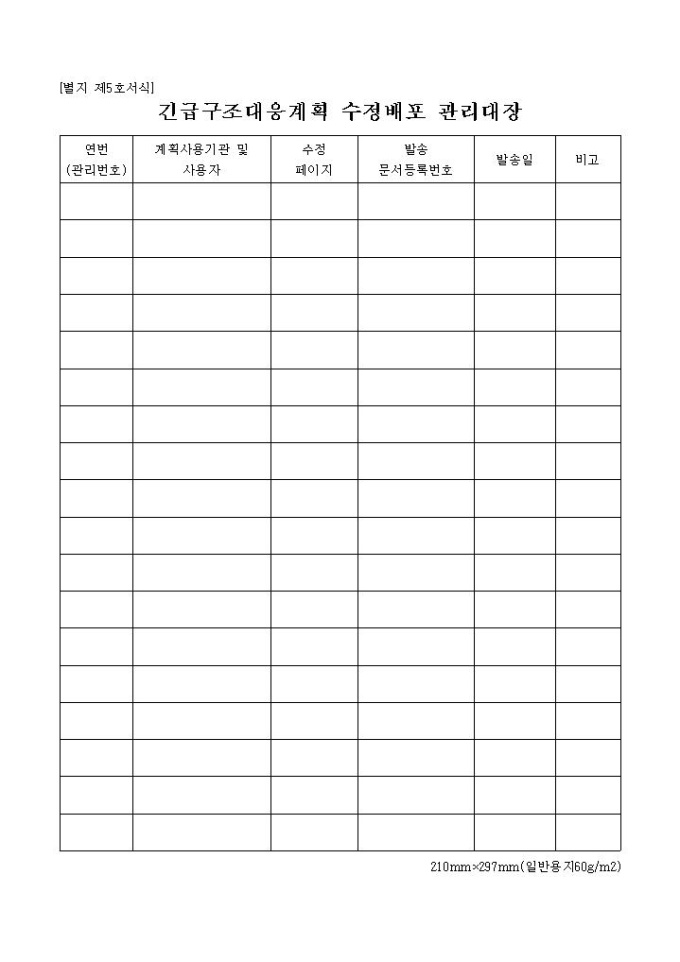 9,000원/월긴급구조대응계획 수정배포 관리대장 양식은 연번(관리번호). 계획사용기관 및 사용자, 수정페이지, 발송 문서등록번호, 발송일 등의 항목으로 구성되어 있습니다.