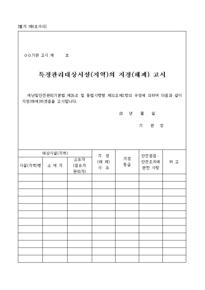 9,000원/월특정관리대상시설(지역)의 지정(해제)고시 대상시설(지역), 지정(해제)사유, 지정등급, 안전점검•안전조치에 관한 사항 등의 항목으로 구성되어 있습니다.