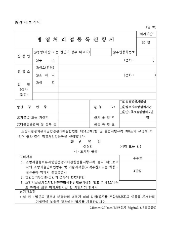 9,000원/월방염처리업등록신청서 양식은 신청인의 성명, 주민등록번호, 주소, 영업소, 임원, 신청업종, 분야, 자본금 또는 자산액 등의 항목으로 구성되어 있습니다.