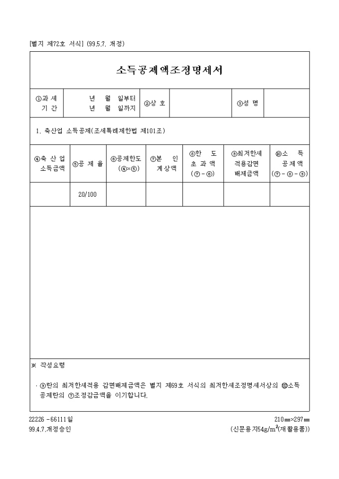 9,000원/월[별지 제72호 서식] 소득공제액조정명세서 양식입니다. ※ 작성요령 ·⑨란의 최저한세적용 감면배제금액은 별지 제69호 서식의 최저한세조정명세서상의 소득공제란의 ⑦조정감금액을 이기합니다.