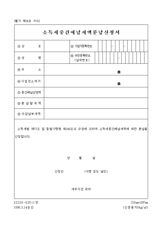 [별지 제34호 서식] 소득세중간예납분납신청서 양식입니다. 소득세법 제77조 및 동법시행령 제140조의 규정에 의하여 소득세중간예납세액에 대한 분납을 신청하실때 사용하는 양식입니다.