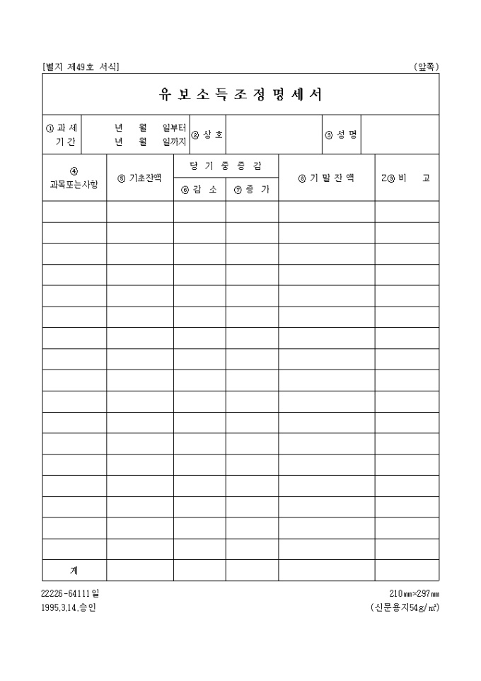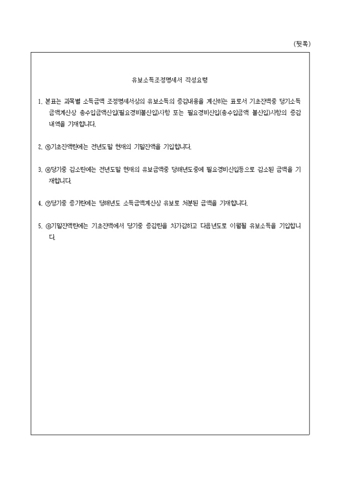 [별지 제49호 서식] 유보소득조정명세서 양식입니다. [유보소득조정명세서 작성요령] 1. 본표는 과목별 소득금액 조정명세서상의 유보소득의 증감내용을 계산하는 표로서 기초잔액중 당기소득금액계산상 총수입금액산입(필요경비불산입)사항 또는 필요경비산입(총수입금액 불산입)사항의 증감내역을 기재합니다. 2. 기초잔액란에는 전년도말 현재의 기말잔액을 기입합니다. 3. 당기중 감소란에는 전년도말 현재의 유보금액중 당해년도중에 필요경비산입등으