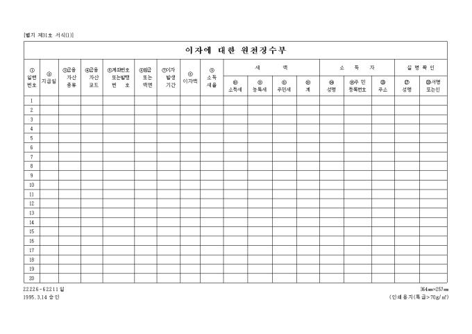 이자에대한원천징수부 양식입니다.
