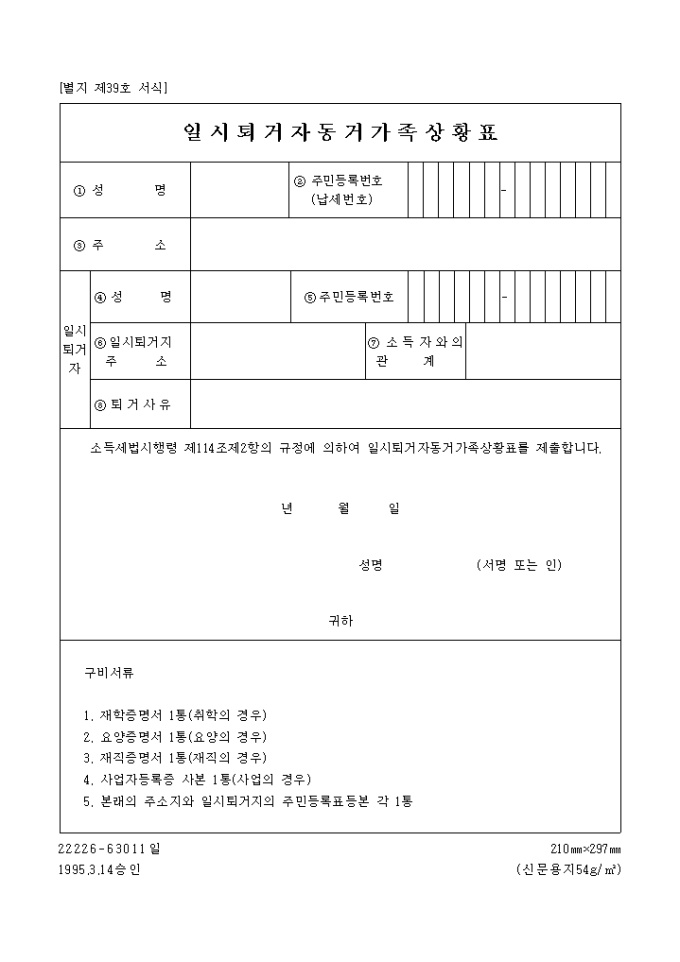 9,000원/월[별지 제39호 서식] 일시퇴거자동거가족상황표 양식입니다. 소득세법시행령 제114조제2항의 규정에 의하여 일시퇴거자동거가족상황표를 제출하실때 사용하는 양식입니다.