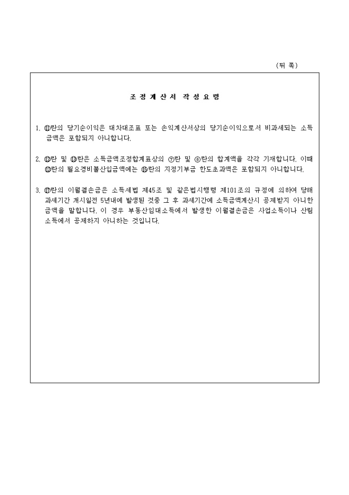 9,000원/월[별지 제46호 서식] 조정계산서 양식입니다. [조 정 계 산 서 작 성 요 령] 1. 란의 당기순이익은 대차대조표 또는 손익계산서상의 당기순이익으로서 비과세되는 소득금액은 포함되지 아니합니다. 2. 란 및 란은 소득금액조정합계표상의 ⑦란 및 ⑧란의 합계액을 각각 기재합니다. 이때 란의 필요경비불산입금액에는 란의 지정기부금 한도초과액은 포함되지 아니합니다. ...