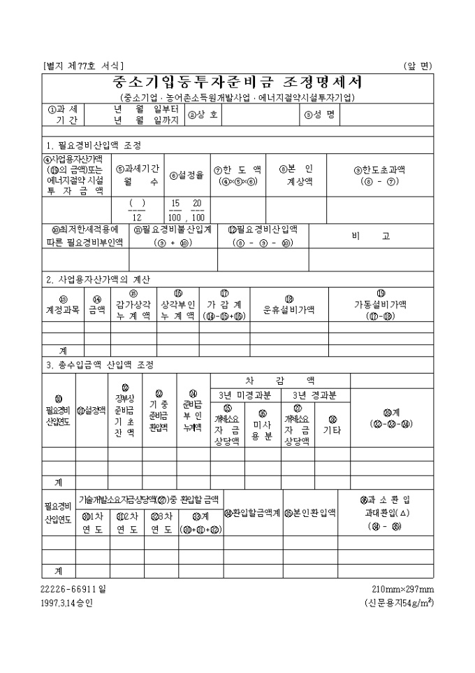 9,000원/월[별지 제77호 서식] 중소기업등투자준비금조정명세서 양식입니다. [중소기업등투자준비금 조정명세서 작성요령] 1. 중소기업·농어촌소득원개발사업·에너지절약시설투자기업중 해당란에(○)표합니다. 2. ⑤과세기간월수란에는 당해 과세기간월수를 기입합니다. 3. ⑥설정율은 해당율에 (○)표를 하되 중소기업의 사업용자산과 농어촌소득개발사업의 도서지역사업용 자산은 20/100으로 합니다. ....