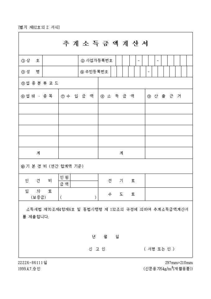 [별지 제82호의 2 서식] 추계소득금액계산서 양식입니다. 소득세법 제70조제4항제6호 및 동법시행령 제 132조의 규정에 의하여 추계소득금액계산서를 제출하실때 사용하는 양식입니다.