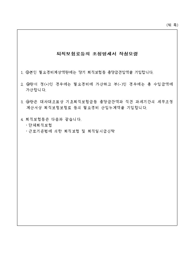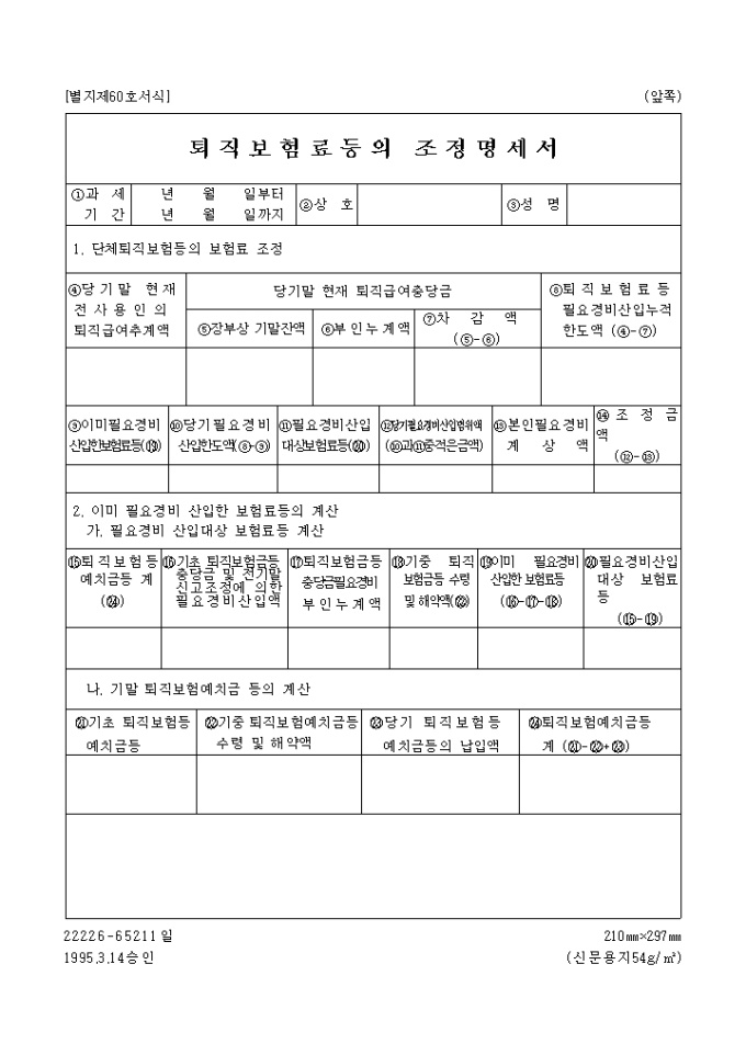 9,000원/월[별지제60호서식] 퇴직보험료등의조정명세서 양식입니다. 1. 단체퇴직보험등의 보험료 조정 2. 이미 필요경비 산입한 보험료등의 계산 가. 필요경비 산입대상 보험료등 계산 나. 기말 퇴직보험예치금 등의 계산의 세부항목으로 구성된 양식입니다.