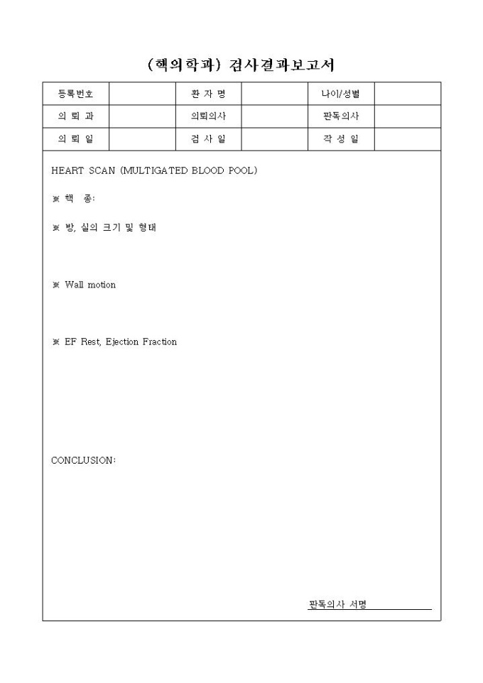 핵의학과에서 검사 후 그 검사결과를 보고하는 양식입니다. 등록번호, 환자명, 나이/성별, 의뢰과, 의뢰의사, 판독의사, 의뢰일, 검사일, 작성일, 등의 항목으로 구성되어 있습니다. 핵종, 방, 실의 크기 및 형태, Wall motion, EF Rest, Ejection Fraction, CONCLUSION의 내용을 기록합니다.