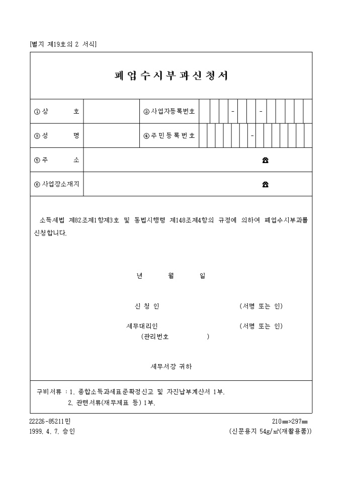 [별지 제19호의 2 서식] 폐업수시부과신청서 양식입니다. 소득세법 제82조제1항제3호 및 동법시행령 제148조제4항의 규정에 의하여 폐업수시부과를 신청하실때 사용하는 양식입니다.
