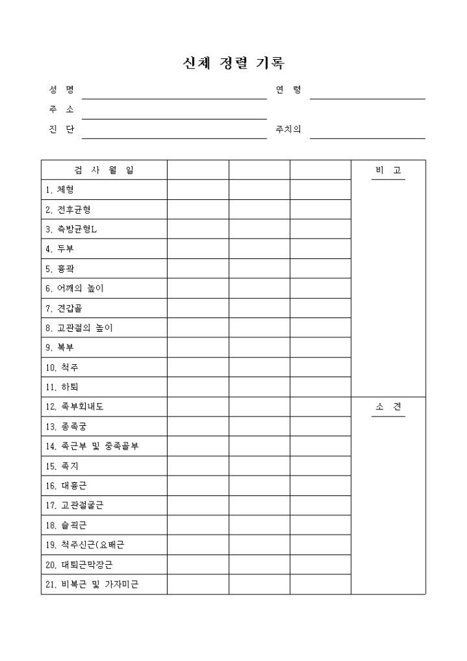 신체 정렬에 대한 기록을 할 때 사용하는 양식입니다. 각 신체내 골격별로 정렬에 대한 기록을 할 수 있습니다.
