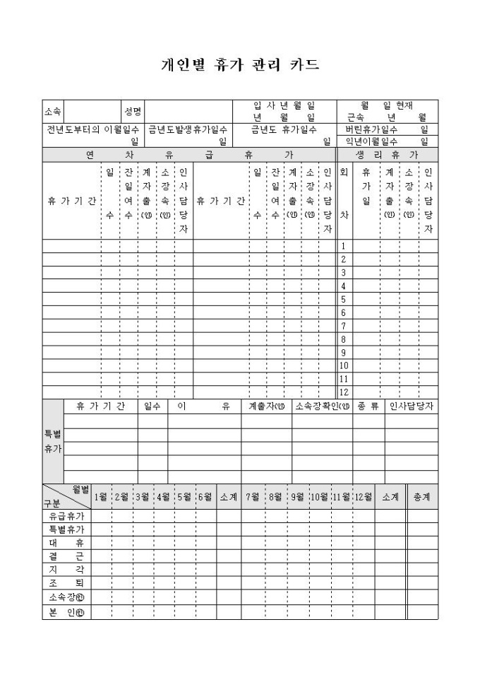 9,000원/월개인별로 휴가 기간을 기록하여 관리할 수 있는 서식으로써, 휴가의 종류에 따라 구분하여 사용할 수 있어 편리합니다.
