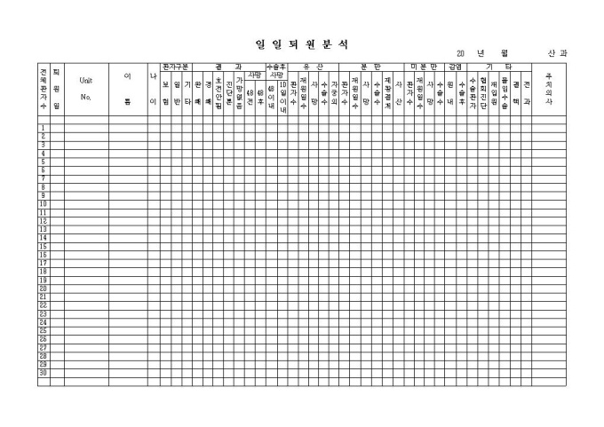 산과에서 사용하는 일일퇴원분석지로서 매일마다 퇴원환자에 대한 진료내용 및 결과에 대해 기록, 관리하는 양식입니다.