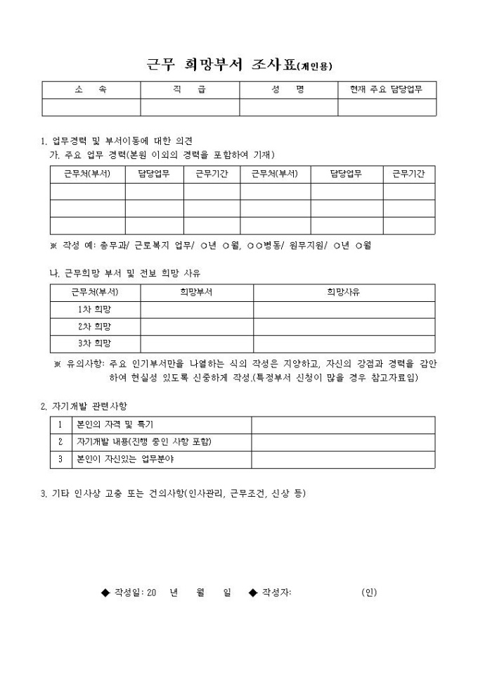 9,000원/월근로자에 대해 부서이동에 대한 의견과 희망여부에 대한 조사를 할 때 사용하는 양식입니다.