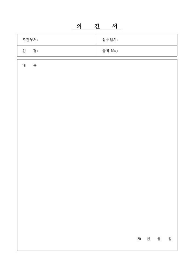 9,000원/월일반적으로 사용하는 의견서 양식입니다. 주관부서, 접수일시, 건명, 등록 No, 내용의 항목으로 구성되어 있습니다.
