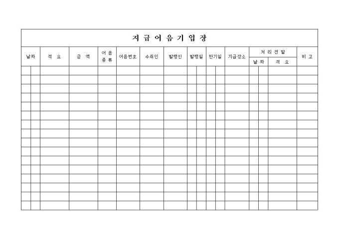 9,000원/월날짜, 적요, 금액, 어음종류, 어음번호, 수취인, 발행인, 발행일, 만기일, 지급장소, 처리전말, 비고의 항목으로 구성되어 있는 지급어음기입장 양식입니다.
