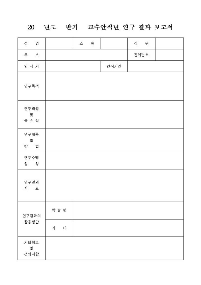 안식년 기간동안 연구한 결과를 보고하는 양식입니다. 간단한 인적사항과 연구목적, 연구배경및중요성, 연구내용및방법, 연구수행일정, 연구결과개요, 연구결과의 활용방안, 가타참고및건의사항 등의 항목으로 구성되어 있습니다.