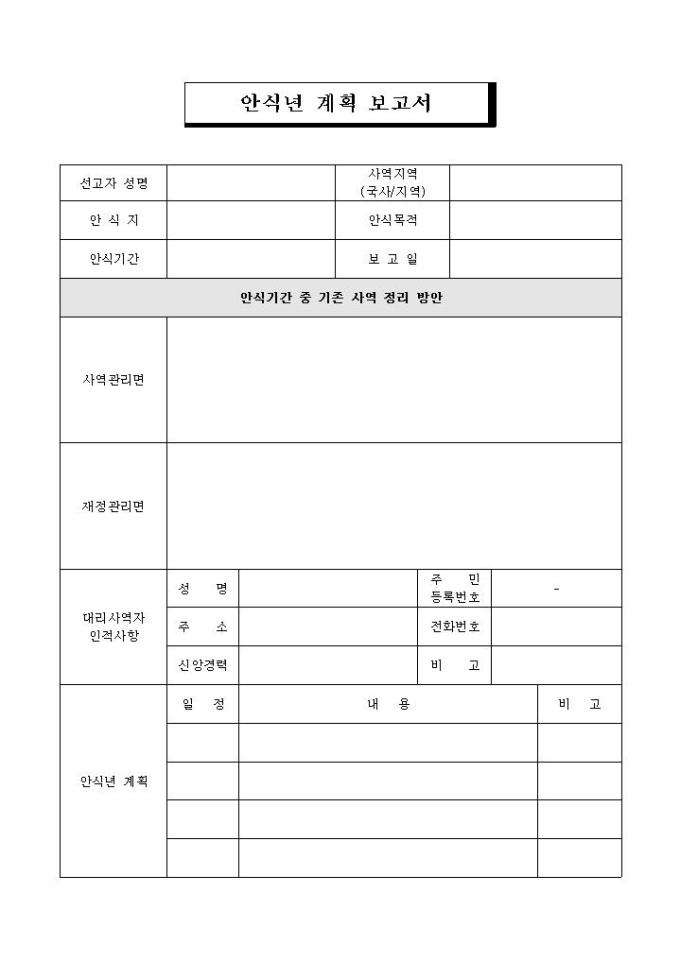 안식년 동안의 계획을 상세히 기록하고 보고할 때 사용하는 양식입니다. 간단한 인적사항과, 안식기간 중 기존 사역 정리 방안, 안식년 계획 등의 항목으로 구성되어 있습니다.