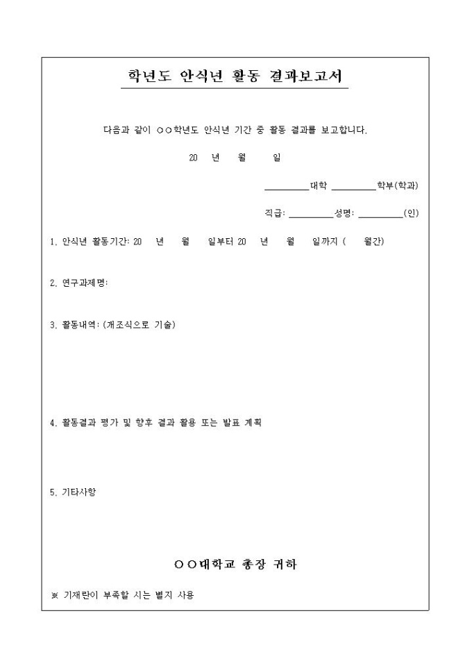 안식년 기간 중 활동한 결과를 보고할 때 사용하는 양식입니다. 활동기간, 연구과제명, 활동내역, 활동결과 평가 및 향후 결과 활용 또는 발표 계획, 기타사항의 항목으로 구성되어 있습니다.