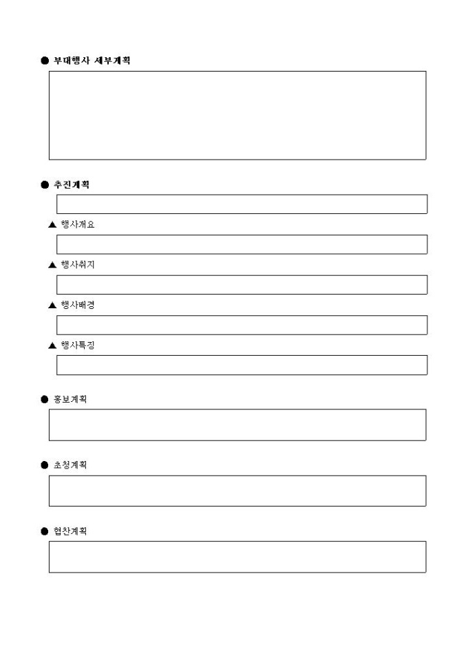 9,000원/월행사를 기획할 때 사용하는 행사 기획서 양식입니다. 행사개요, 기본구성계획, 운영계획, 부대행사 세부계획, 추진계획, 홍보계획, 초청계획, 협찬계획 등의 항목을 기록할 수 있습니다.