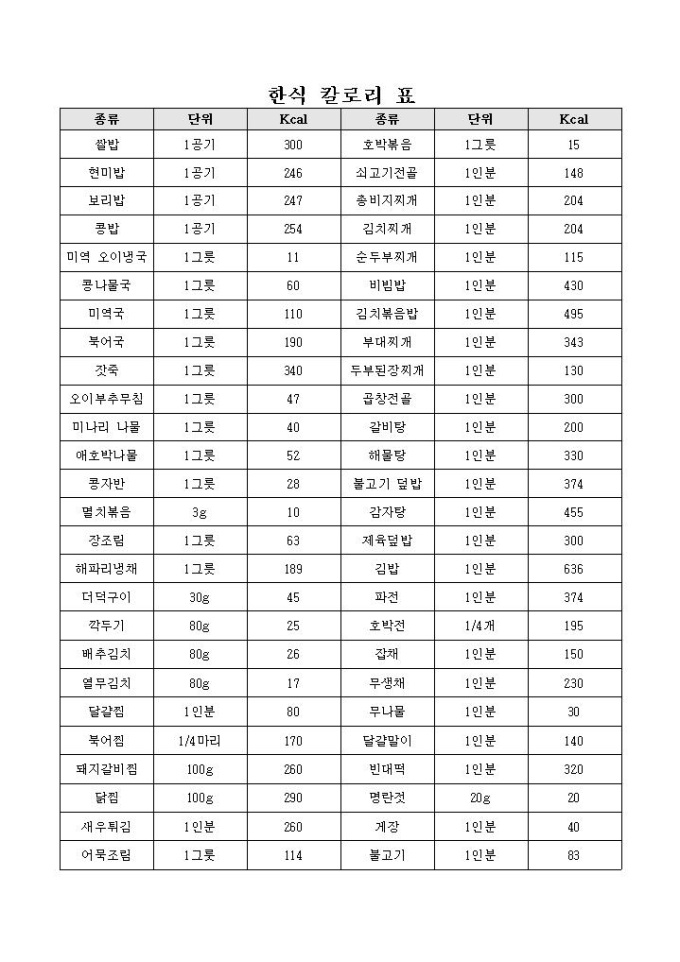 한식 칼로리 표