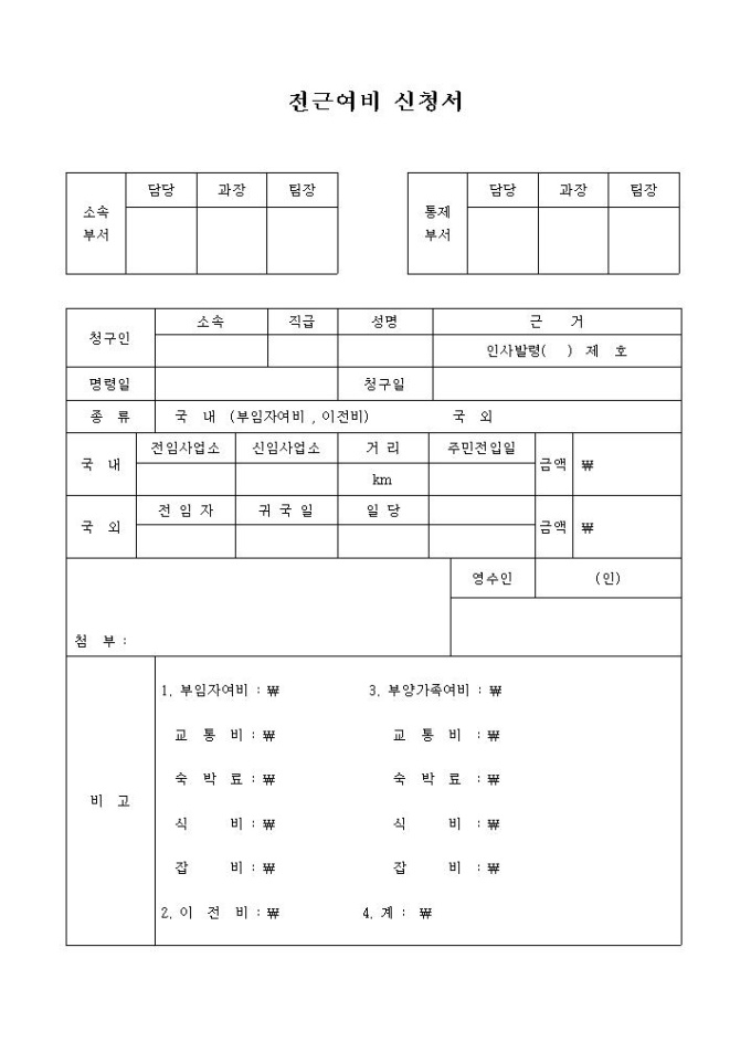 전근 여비 신청서
