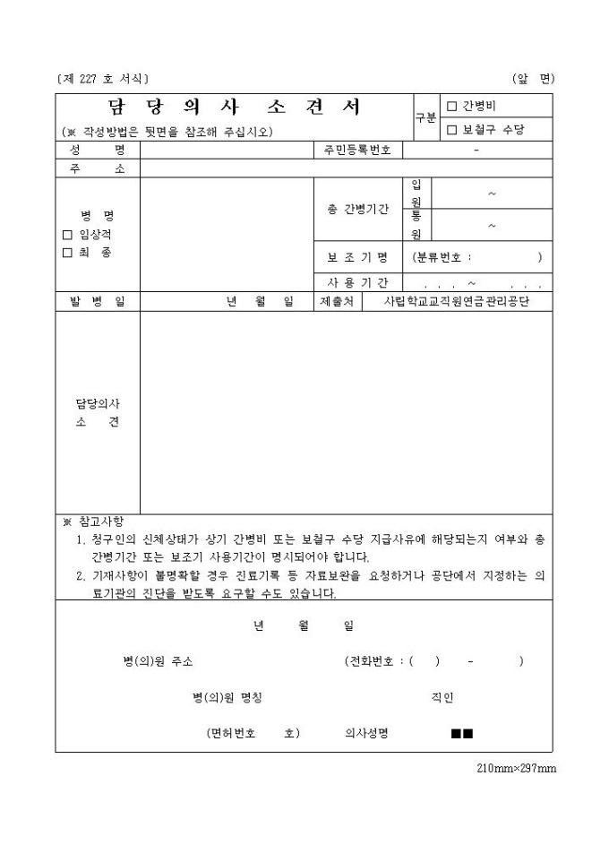 9,000원/월환자의 인적사항, 병명, 간병기간, 담당의사 소견 등의 작성할 수 있으며, 간병비 지급대상 및 지급기준에 관한 내용을 볼 수 있습니다.