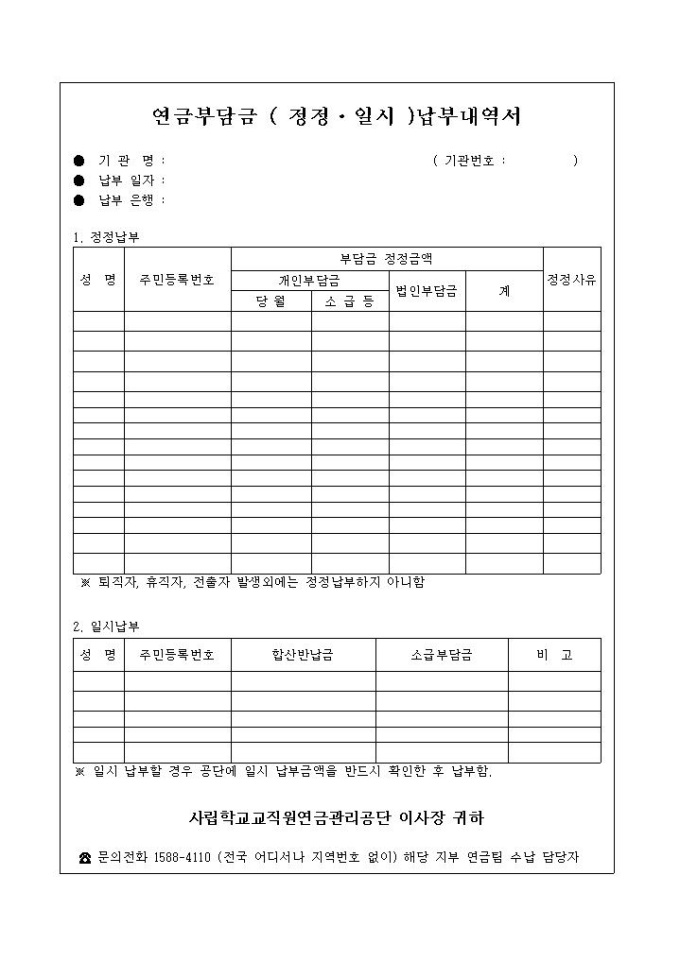 연금부담금 정정 및 일시 납부내역서는 정정납부, 일시납부에 대한 항목으로 구성되어 있습니다.
