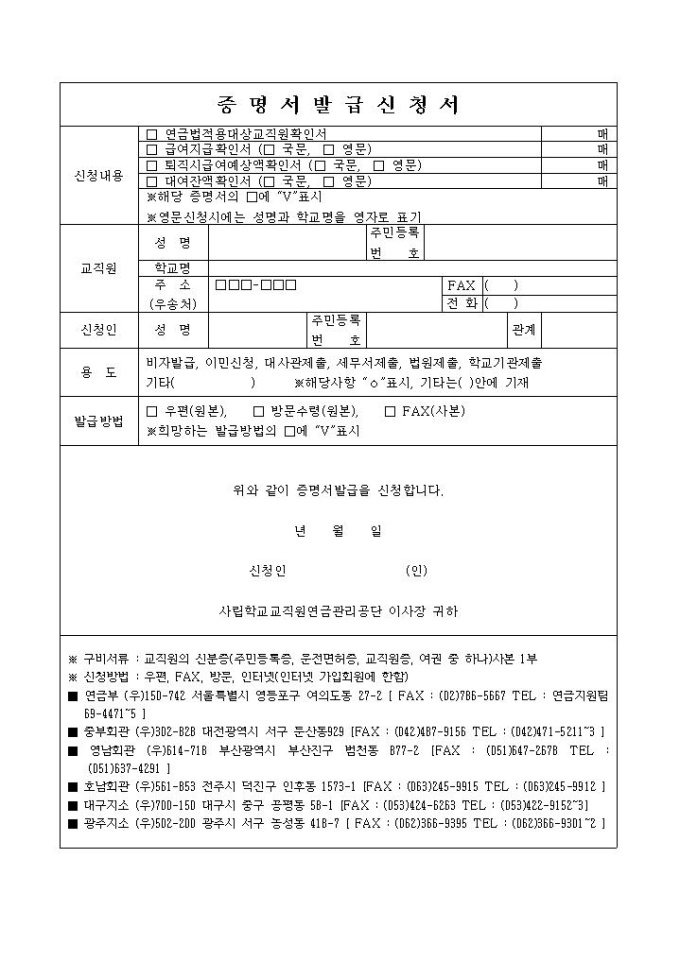 9,000원/월증명서 발급 신청서는 신청내용, 교직원의 인적사항, 신청인의 인적사항, 용도, 발급방법 등의 항목으로 구성되어 있습니다.
