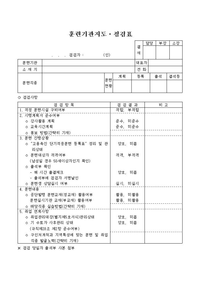 훈련기관 지도 및 점검표는 훈련기관, 소재지, 훈련직종, 점검사항 등의 항목으로 구성되어 있습니다.