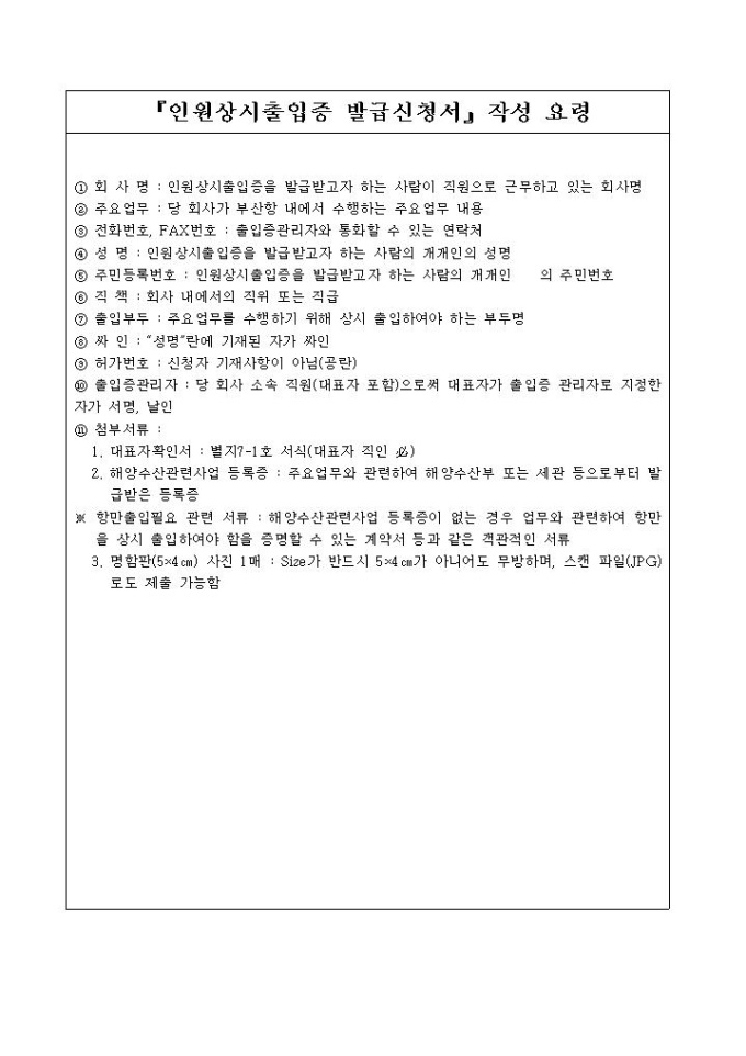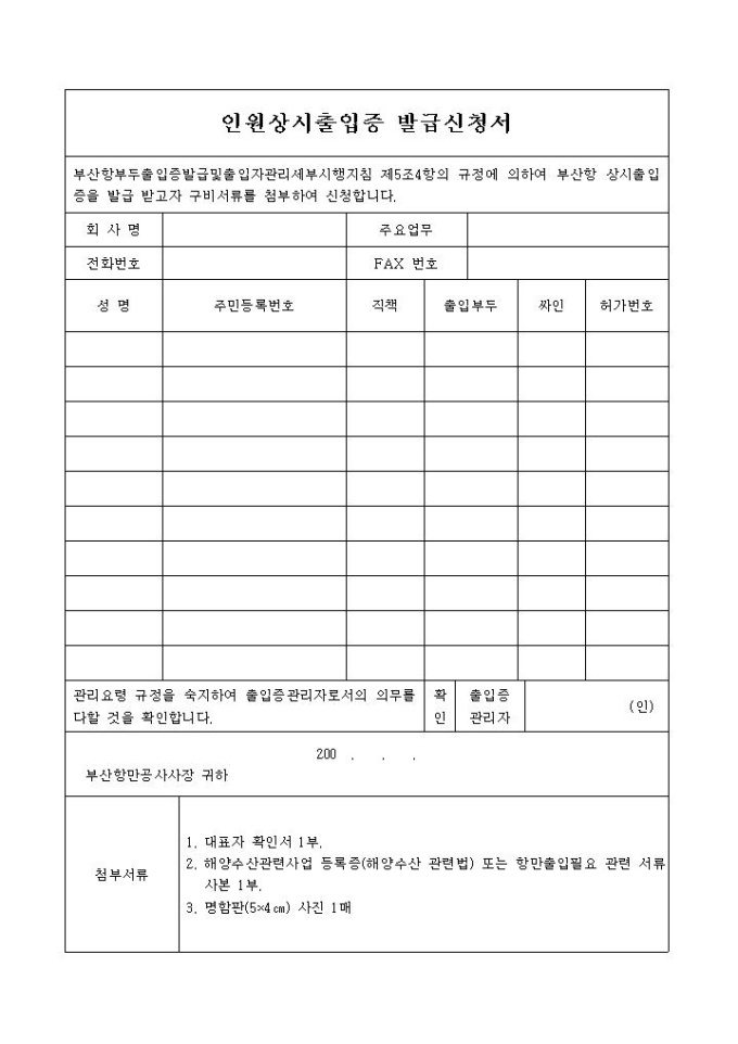 9,000원/월부산항부두출입증발급 및 출입자관리세부시행지침 제5조4항의 규정에 의하여 부산항 상시출입증을 발급 받고자 구비서류를 첨부하여 신청할 때 사용하는 양식입니다.