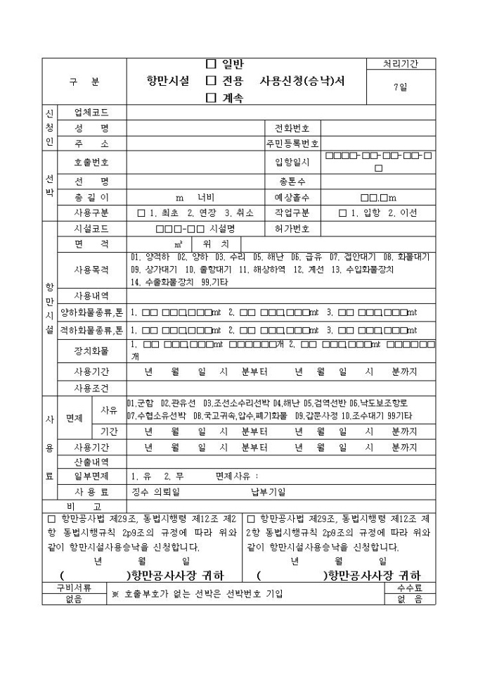 항만시설 일반, 전용, 계속 사용 신청 및 승낙서는 신청인의 인적사항을 비롯하여 선박, 항만시설, 사용료 등의 항목으로 구성되어 있습니다.
