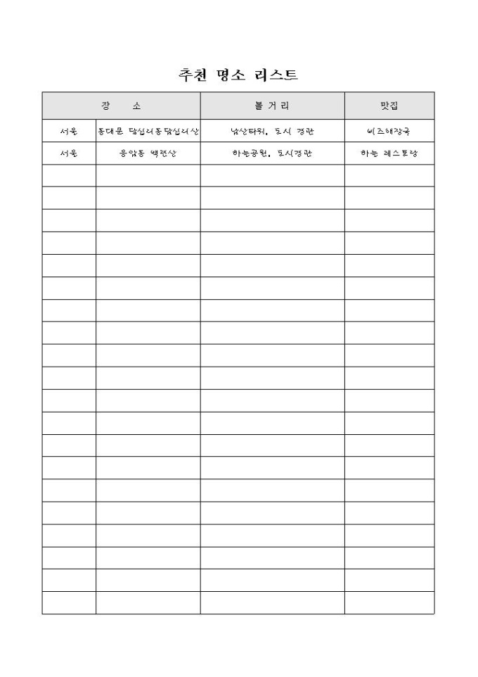 9,000원/월추천할 만한 명소를 장소, 볼거리 외에 맛집까지 정리할 수 있게 구성되어있는 리스트 양식입니다.