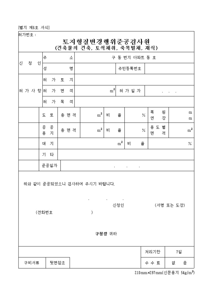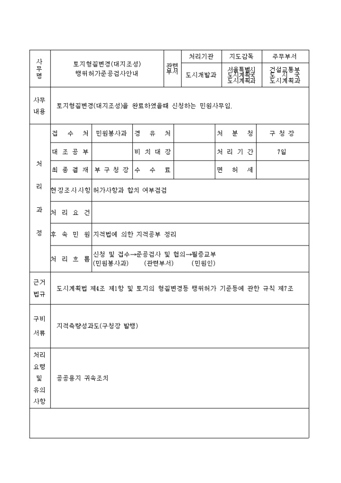 토지형질변경(대지조성)을 완료하였을때 신청하는 민원사무양식입니다.