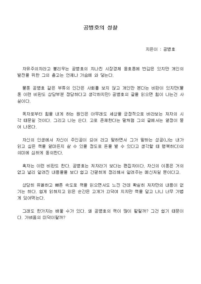 자유주의자라고 불리우는 공병호의 지나친 시장경제 옹호론에 반감은 있지만 개인의 발전을 위한 그의 충고는 언제나 가슴에 와 닿는다.