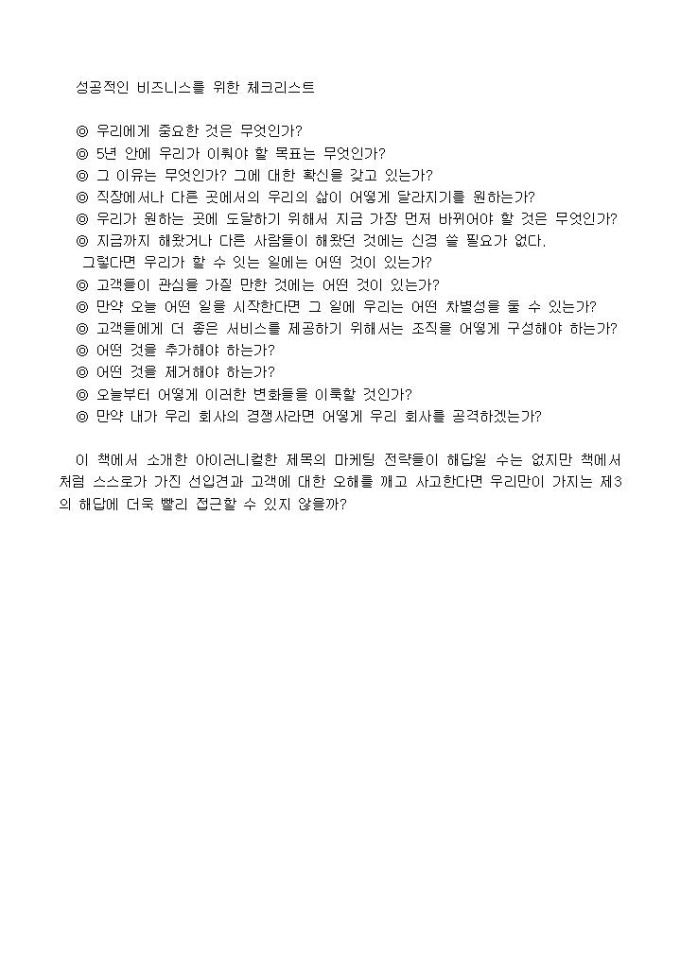 우리의 고객이 좋아하는 것은 무엇인가? 우리는 우리의 고객이 원하는 것을 훤히 꿰뚫고 있다고 자만하고 있지 않은가? 우리는 고객의 말에 귀를 기울이고 있는가? 우리가 펼치는 전략은 고객의 needs에 적합한 것인가?